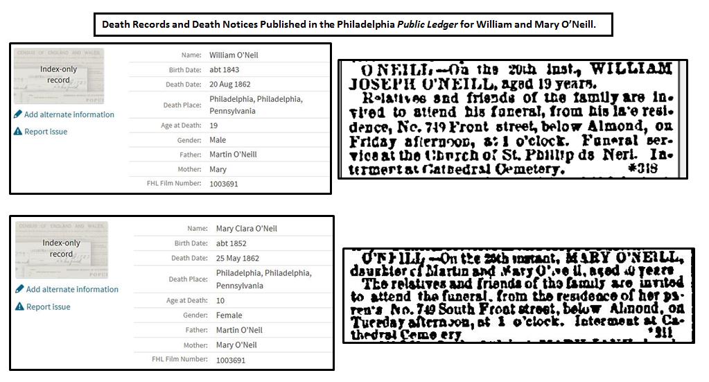 Another fact that can be verified is that William did indeed die in 1862 at the age of 19 and is buried in Philadelphia. It adds up that his injuries from the war are what contributed to his death at such a young age. I was able to find a death notice for William and one for Mary Clare as well, who sadly died just three months before William in May of 1862 at the age of ten.